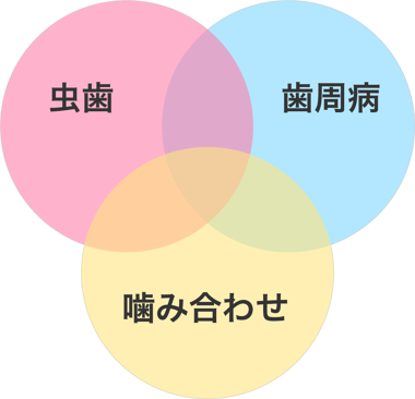 「お口の三大疾患」は、虫歯、歯周病、噛み合わせです。