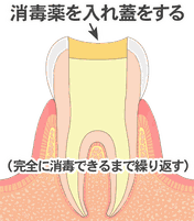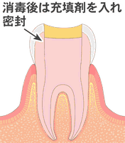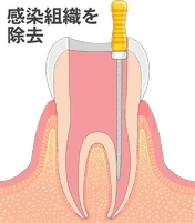 根管治療とは、虫歯が進行して歯髄まで感染した場合に、歯の根内部の感染組織を徹底的に除去し、殺菌消毒した後に薬剤で密封して歯を残す治療方法です。