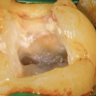 はじめにマイクロスコープを使って虫歯部分を慎重にできる限り取り除き、その上に薬剤(MTA)を入れます。